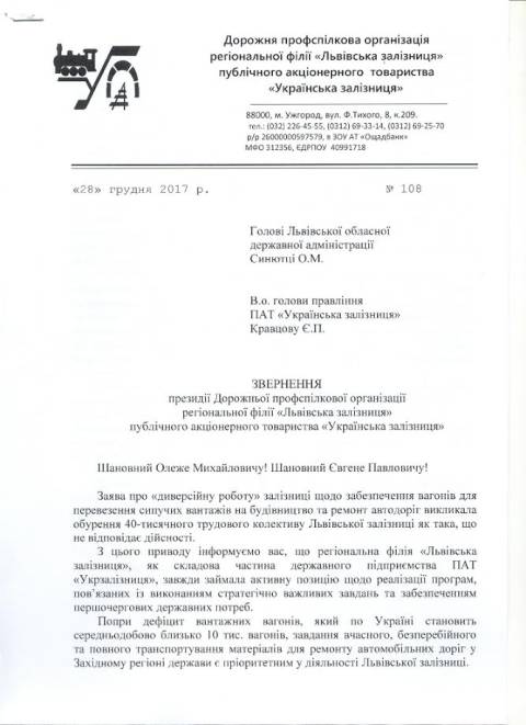 Зокрема, як йдеться у повідомленні, львівські ЗМІ опублікували слова голови Львівської ОДА Олега Синютки, який охарактеризував дії залізничників Львівщини як диверсію щодо забезпечення області вантажними вагонами для перевезення матеріалів на ремонт та будівництво доріг.