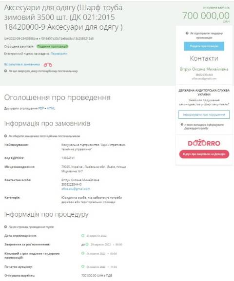 Комунальне підприємство "Адміністративно-технічне управління" оголосило тендер у системі ProZorro на аксесуари для одягу (зимові шарфи), які переможець тендеру має поставити до 15 жовтня 2022 року.