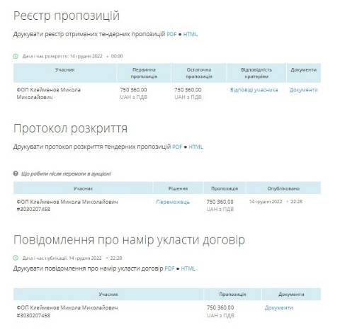 Аукціон стартував 14 грудня, участь у ньому взяв лише підприємець Микола Клейменов з пропозицією постачання тиру за 750 360 грн, якого й оголосили переможцем тендеру. Зазначимо, очікувана вартість послуг становила 850 000 грн.