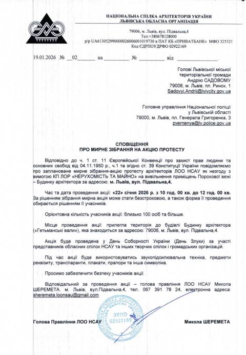 Про це повідомляє Львівська обласна організація Національної спілки архітекторів України (НСАУ) на своїй сторінці у Фейсбуці.