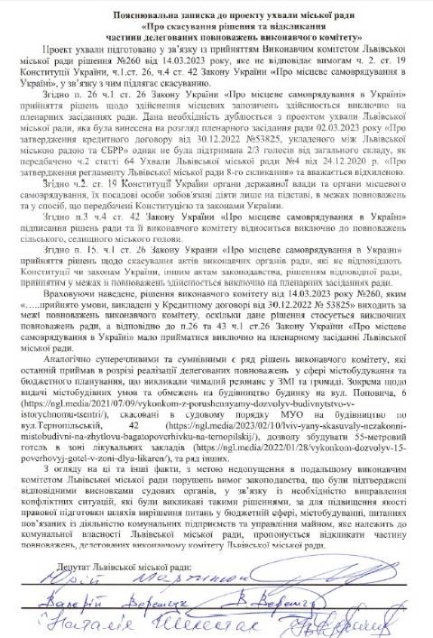 На сайті Львівської міськради депутати підготували та оприлюднили проєкт ухвали, якою пропонують скасувати рішення виконавчого комітету № 260 про умови стабілізаційного кредиту від ЄБРР для комунальних підприємств Львова, а також відкликати частину делегованих повноважень виконкому.