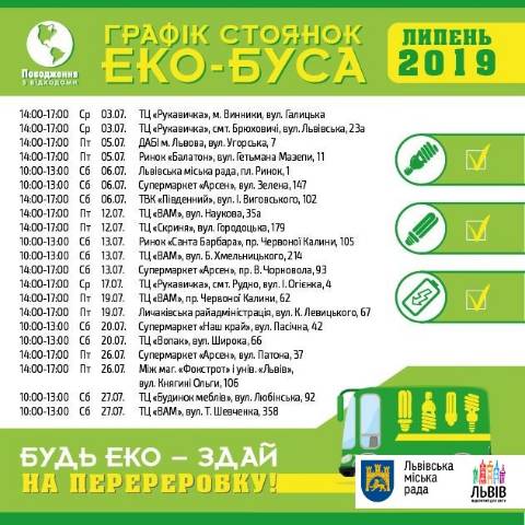 Графік стоянок мобільних пунктів збору відпрацьованих люмінесцентних ламп та батарейок на липень 2019 року: