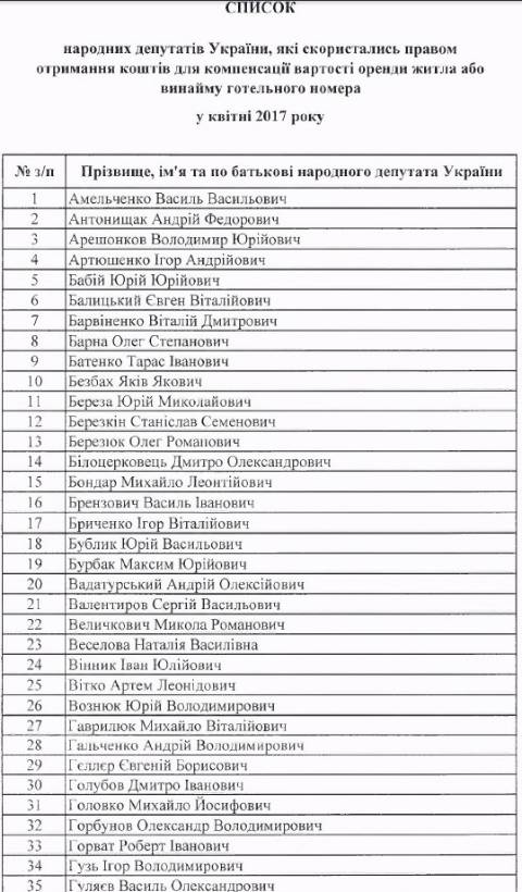 Відтак, у квітні 2017 року 168 народних депутатів отримали кошти для компенсації вартості оренди житла чи готельного номера. Додамо, що у березні їх було 166.