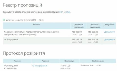 Аукціон стартував 8 лютого, участь у ньому взяли ЛКП "Шляхово-ремонтне підприємство Галицького району" та ФОП Луць О.М, які запропонували здійснити усі роботи за 750 000 грн та 746 151,29 грн відповідно. Переможцем обрали підприємця Оксану Луць, а очікувана вартість послуг становила 1 050 000 грн.