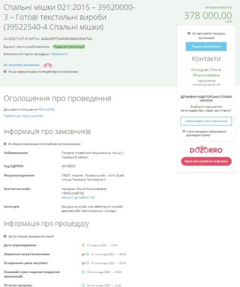Головне управління Національної поліції у Львівській області оголосило тендер у системі ProZorro на закупівлю спальних мішків, які переможець тендеру має поставити до 1 грудня 2022 року.
