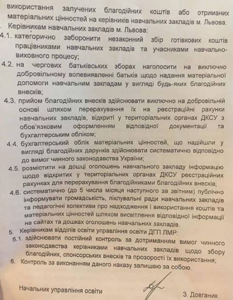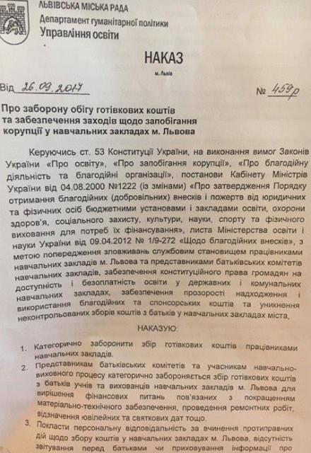 Як йдеться у наказі, представникам батьківських комітетів та учасникам навчально-виховного процесу категорично забороняється збір грошей з батьків учнів та вихованців навчальних закладів Львова для проведення ремонтних робіт.