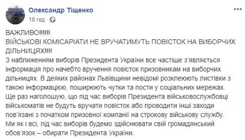 "Ще раз наголошую, що під час виборів Президента військовослужбовці військоматів не будуть вручати повісток або проводити інші заходи пов’язані з початком призовної компанії на строкову військову службу" – заявив він.