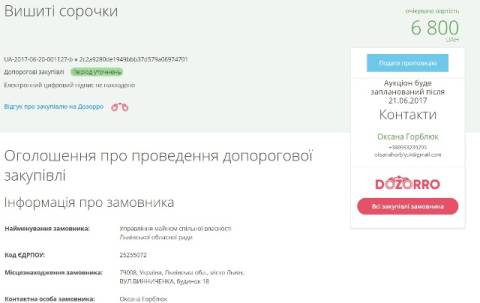 Відтак, управління майном спільної власності Львівської обласної ради проводить закупівлю на 10 штук вишитих сорочок.