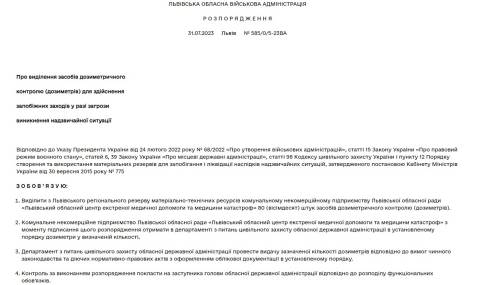 "Виділити з Львівського регіонального резерву матеріально-технічних ресурсів комунальному некомерційному підприємству Львівської обласної ради "Львівський обласний центр екстреної медичної допомоги та медицини катастроф" 80 штук засобів дозиметричного контролю (дозиметрів)" – вказано у розпорядженні.