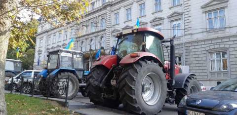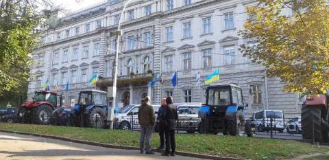 Сьогодні, зранку, перед будівлею Львівської обласної ради, де сьогодні стартує сесія, зібралися близько 30 активістів з плакатами, а також вони привезли із собою трактори.