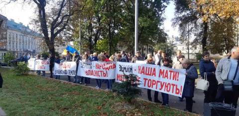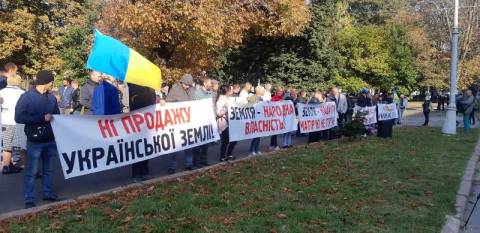 Протестувальники влаштували мирну акція протесту з вимогою до депутатів звернутися до Верховної Ради та уряду й висновити протест планам президента Володимира Зеленського та його оточення скасувати мораторій на продаж землі.