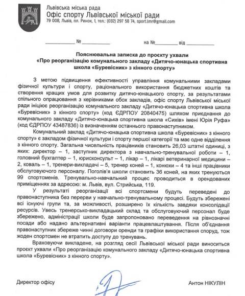 На сайті Львівської міськради оприлюднили проєкт ухвали про реорганізацію комунального закладу "Дитячо-юнацька спортивна школа "Буревісник" з кінного спорту" та зміну назви комунального закладу "Дитячо-юнацька спортивна школа "Сихів" імені Юрія Руфа".