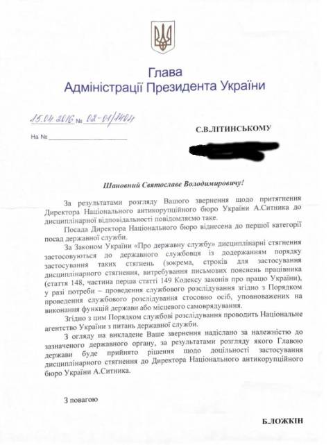 Про це йдеться у листі-відповіді на звернення до Глави Адміністрації Президента України Бориса Ложкіна.