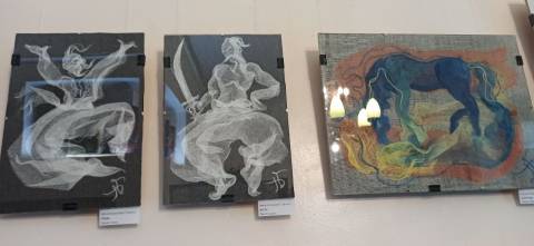 Наталія Бугайова-Гуменюк за допомогою бинта створює картини, які зараз можна побачити в кав'ярні Мазурек.