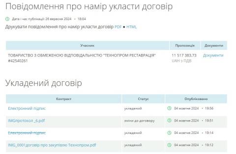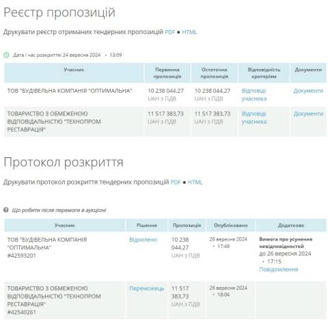 Аукціон відбувся 24 вересня, участь у ньому взяли ТОВ "Будівельна компанія "Оптимальна" та ТОВ "Технопром Реставрація", які запрпонували відремонтувати будівлю Палацу мистецтв за 10 238 044,27 грн й 11 517 383,73 грн відповідно. Переможцем тендеру обрали ТОВ "Технопром Реставрація", а очікувана вартість закупівлі становила 11 714 990,40 грн.