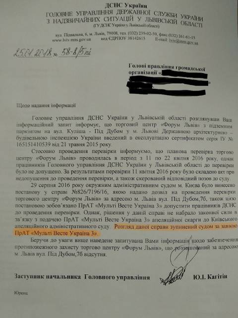 У документі йдеться, що планова перевірка торгового центру "Форум Львів" проводилась в період з 11 по 22 квітня 2016 року, однак працівників ГУ ДСНС у Львівській області не допустили. Про це склали акт про недопущення до проведення перевірки, скерований позов до суду.