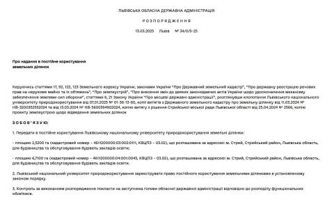 "Передати в постійне користування Львівському національному університету природокористування земельні ділянки: площею 2,5200 га, що розташована за адресою: м. Стрий, Стрийський район, Львівська область, для будівництва та обслуговування будівель закладів освіти; площею 6,7100 га, що розташована за адресою: м. Стрий, Стрийський район, Львівська область, для будівництва та обслуговування будівель закладів освіти" – йдеться у розпорядженні.