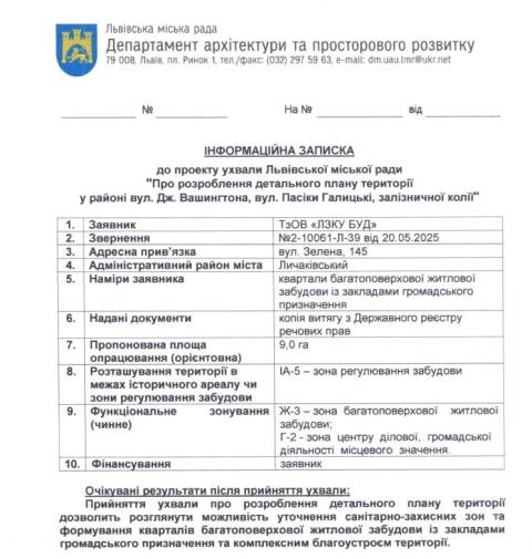На сайті Львівської міськради оприлюднили проєкт ухвали, якою пропонують розробити детальний план території у районі вул. Дж. Вашингтона, вул. Пасіки Галицькі, залізничної колії.