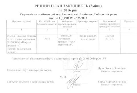 Про це йдеться у додатку до річного плану закупівель Львівської обласної ради на 2016 рік, опублікованому 6 липня 2016 року.
