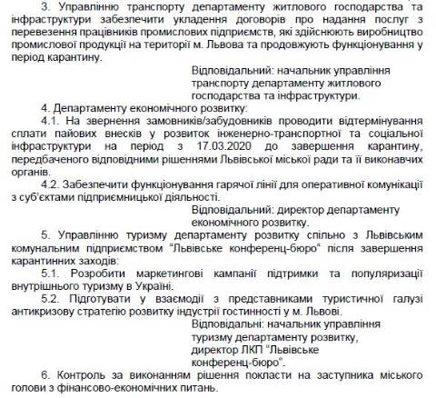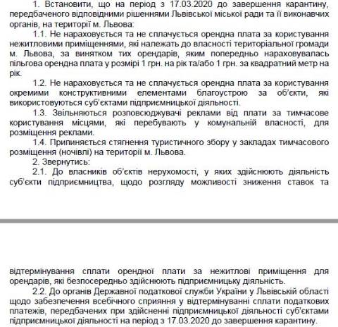 "Припиняється стягнення туристичного збору у закладах тимчасового розміщення (ночівлі) на території м. Львова. До органів Державної податкової служби України у Львівській області щодо забезпечення всебічного сприяння у відтермінуванні сплати податкових платежів, передбачених при здійсненні підприємницької діяльності суб’єктами підприємницької діяльності на період з 17.03.2020 до завершення карантину" – вказано у документі.