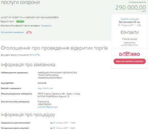 Інформацію про відкриті торги на послуги охорони оприлюднено на сайті публічних закупівель "Prozorro".