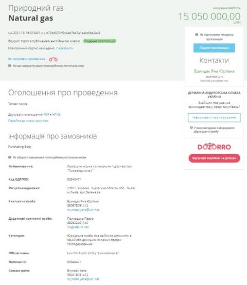 Львівське міське комунальне підприємство "Львівводоканал" оголосило у системі ProZorro послуги із закупівлі природного газу, які переможець тендеру має доставити до 31 грудня 2022 року.