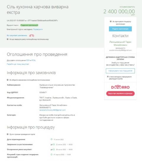 Львівське міське комунальне підприємство "Львівводоканал" оголосило тендер у системі ProZorro на придбання кухонної харчової виварної солі та таблетованої солі, яку переможець тендеру має поставити до 31 грудня 2022 року.