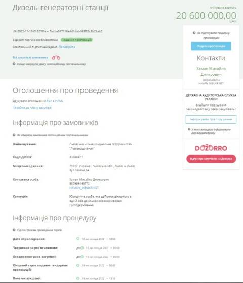 Львівське міське комунальне підприємство "Львівводоканал" оголосило тендер у системі ProZorro на придбання дизель-генераторних станцій, які переможець тендеру має поставити до 31 грудня 2022 року.
