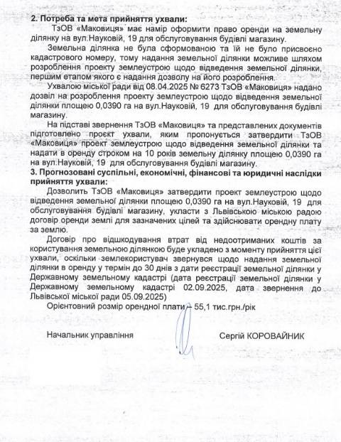 Згідно з документом, йдеться про земельну ділянку площею 0,0390 га на вул. Науковій, 19 у Франківському районі Львова, що станом на сьогодні є несформованою й щодо неї депутати Львівської міськради не приймали жодних ухвал. Ділянка призначена для будівництва та обслуговування будівель торгівлі.