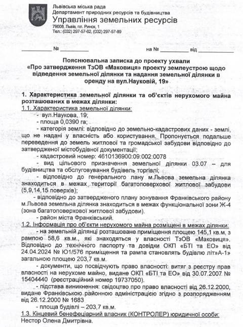 На сайті Львівської міськради оприлюднили проєкт ухвали про затвердження ТзОВ "Маковиця" проєкту землеустрою щодо відведення земельної ділянки та надання земельної ділянки в оренду на вул. Науковій, 19.