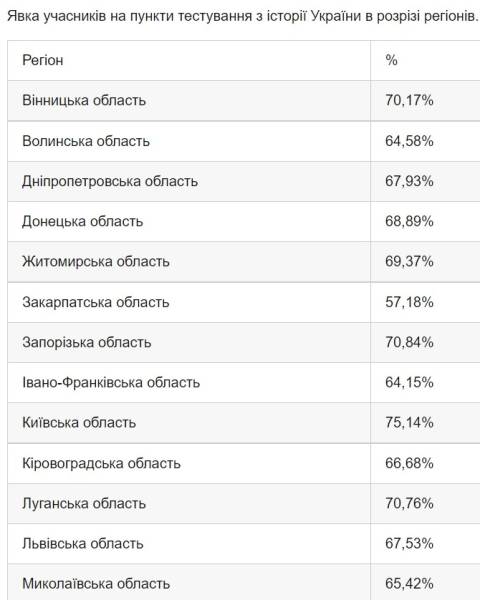 У п'ятницю, 4 червня, у рамках основної сесії зовнішнього незалежного оцінювання відбулося тестування з історії України. Участь у ньому взяли 203 361 особа, що становить 68% від загальної кількості зареєстрованих.