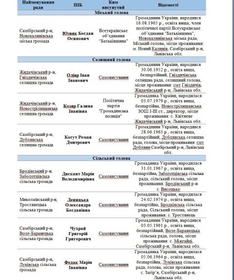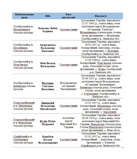 Головами об’єднаних громад на Львівщини обрано в переважній більшості голів «центральних» громад (тобто тих, на основі яких сформовано об’єднану громаду) – в 12 об’єднаних громадах.