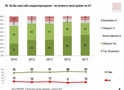 Згідно з результатами дослідження, проведеного Соціологічною групою "Рейтинг" 2-13 серпня цього року, 83% опитаних вважають себе патріотами своєї країни.