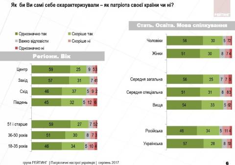 У всіх регіонах України, кількість тих, хто вважає себе патріотом України перевищує 75%: на Заході – 88%, у Центрі – 84%, на Сході – 83%, на Півдні – 77%.
