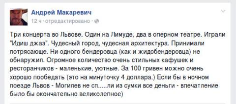 "Три концерти у Львові. Один в Limude, два в Оперному театрі. Грав "Ідиш джаз". Прекрасні міста, чудова архітектура. Взяти казкові. Бандерівця не знайшов. Величезна кількість дуже затишних кафе і ресторанчиків. Враження було б чудовим, якби не вкрали у нічному поїзді Львів-Могилів всі гроші з сумки", – зазначив Макаревич.
