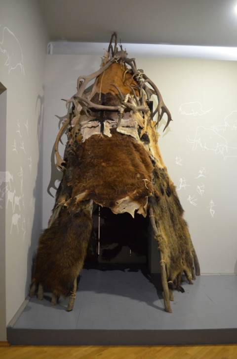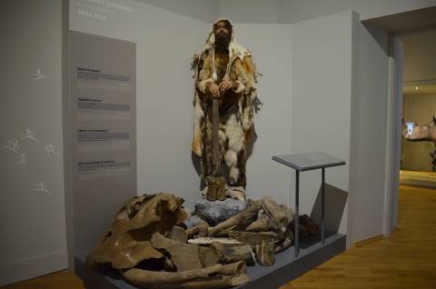 Про давню людину музейники теж не забули. У наступній кімнаті виставки знаходиться фігура людини пізньої кам'яної доби, кроманьйонця, яку, хочу зауважити, виконали дуже ретельно. Можна розгледіти навіть найдрібніші деталі. Кроманьйонці були першими відомими представниками людини розумної в Європі. Вони витіснили неандертальців близько 40 тисяч років тому і проіснували близько 30 тисяч років. Кроманьйонці полювали на великих тварин – мамутів, бізонів, оленів, диких коней. Знаряддя праці виготовляли в більшості із кременю або кісток. Вони першими почали будувати шатра, для яких використовували кістки та шкіру впольованої здобичі (переважно мамутів). За зростом та тривалістю життя кроманьйонці були майже такі ж, як і сучасні люди. Оскільки племена жили ізольовано, то інфекції між людьми передавалися рідко, тож передчасно загинути мисливець на мамутів міг лише під час полювання.