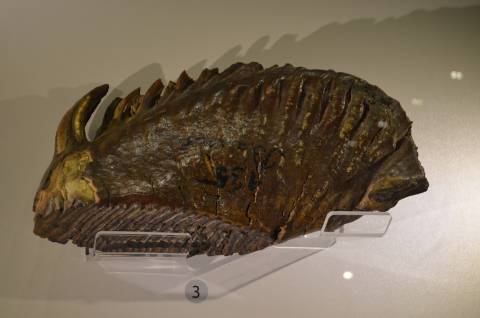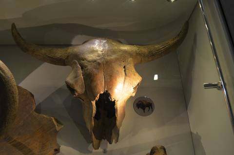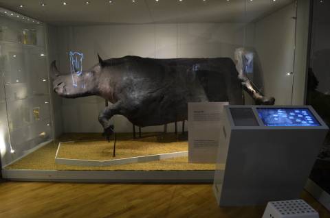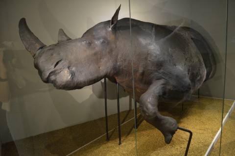Носоріг волохатий – один із найбільших представників мегафауни льодовикового періоду Північної Євразії. Довжина тіла – 3,2-3,6 метри, висота в загривку – 1,4-1,6 метри. Вага дорослих самців сягала понад 2 тони. Вимер в Європі близько 12 тисяч років тому. Цей вид славиться довгим, густим волоссям, звідки й назва, і товстою шкірою, яка захищала від холоду. На морді волохатий носоріг мав 2 роги, один із яких міг сягати понад метр і слугував зброєю, а взимку – "лопатою" для розгортання снігу, щоб знайти поживу. Біля експонованого носорога встановили мультимедійний кіоск, який демонструє еволюцію та різноманіття родини носорогових. Усього родина носорогових налічує 61 рід, з яких 57 – вимерли. У наш час живе лише 5 видів носорогів, які поширені в Африці та Азії.