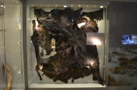 Та із шкірою мамута трапилася ще одна цікава детективна історія. Про це розповідає завідувачка відділу прикладної музеології ДПМ НАН України Наталія Дзюбенко у відео, яке можна подивитися на одному з екранів у виставковому залі та прослухати через спеціальний навушник. 2013 року вчені львівського музею випадково виявили, що в Зальцбургу, в Музеї "Будинок природи" представили експонати – фрагменти шкіри та м'язів мамонта, підписані як знахідки у селі Старуня в Східних Карпатах у Польщі. Та науковців зацікавила не так географічна помилка, як те, що усі об'єкти, знайдені в Старуні, передали до Львівського музею Дідушицьких (як він тоді ще називався), а про передачу деяких фрагментів до Австрії не було жодних відомостей.