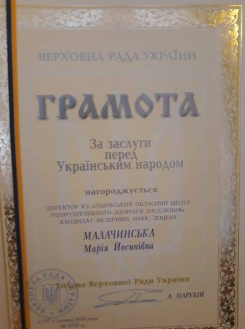 4 жовтня директора КЗ «Львівський обласний центр репродуктивного здоров’я населення» Марію Малачинську нагородили Грамотою Верховної Ради України за заслуги перед Українським народом.