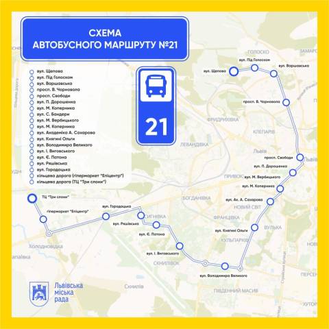 Автобуси № 21 курсуватимуть: кільцева дорога (ТЦ "Три слони") – кільцева дорога (гіпермаркет "Епіцентр") – вул. Городоцька – вул. Ряшівська – вул. Є. Патона – вул. І. Виговського – вул. Володимира Великого – вул. Княгині Ольги – вул. Академіка А. Сахарова – вул. М. Коперника – вул. П. Дорошенка – просп. Свободи – пл. Різні – просп. В. Чорновола – вул. Варшавська – вул. Під Голоском – вул. Щепова – вул. Під Голоском – вул. Варшавська – просп. В. Чорновола – просп. Свободи – вул. П. Дорошенка – вул. М. Коперника – вул. С. Бандери – вул. М. Вербицького – вул. М. Коперника – вул. Академіка А. Сахарова – вул. Княгині Ольги – вул. Володимира Великого – вул. І. Виговського – вул. Є. Патона – вул. Ряшівська – вул. Городоцька – кільцева дорога (гіпермаркет "Епіцентр") – кільцева дорога (ТЦ "Три слони").