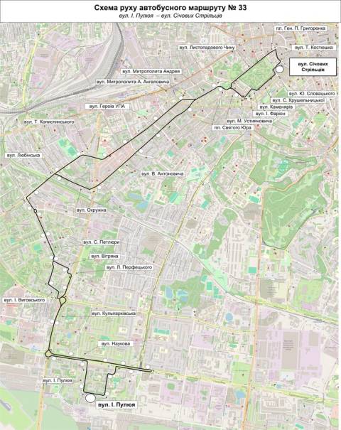 Після погодження нової схеми руху поліцією автобуси № 33 курсуватимуть: вул. І. Пулюя – вул. Наукова – вул. Кульпарківська – вул. І. Виговського – вул. С. Петлюри – вул. Любінська – вул. Окружна – вул. В. Антоновича – вул. Митрополита Андрея – пл. Святого Юра – вул. М. Устияновича – вул. І. Фаріон – вул. Каменярів – вул. С. Крушельницької – вул. Ю. Словацького – вул. Січових Стрільців – вул. Т. Костюшка – пл. Генерала П. Григоренка – вул. Листопадового Чину – пл. Святого Юра – вул. Митрополита Андрея – вул. Митрополита А. Ангеловича – вул. Героїв УПА – вул. Т. Копистинського – вул. Любінська – вул. С. Петлюри – вул. Вітряна – вул. Кульпарківська – вул. Л. Перфецького – вул. Кульпарківська – вул. Наукова – вул. І. Пулюя.