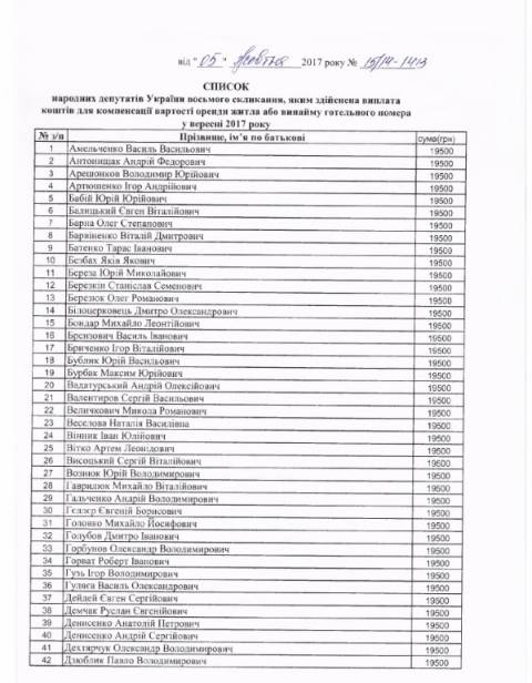 Відтак, у вересні 2017 року 171 народний депутат отримав кошти для компенсації вартості оренди житла чи готельного номера. Додамо, що у серпні їх було 168.