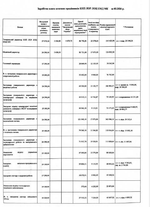 Заступник Васька з медичної роботи отримав 106 905,57 грн нарахованої зарплати, заступник з міжнародної співпраці та медицини катастроф – 79 149,99 грн, заступник з економічних питань – 162 506,10 грн, заступник з технічних питань – 110 016 грн, медичний директор – 126 852,50 грн.