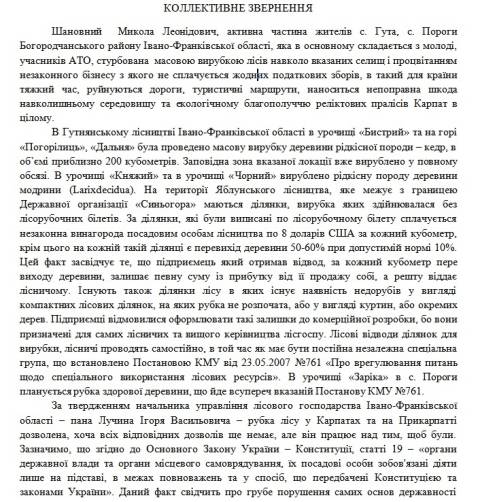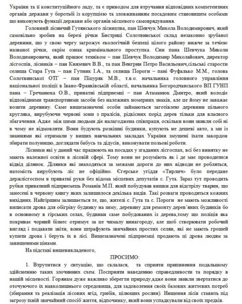 "Єгерське угіддя "Тирлич" було передане держлісгоспом в приватні руки без відома місцевих депутатів с. Гута. Зараз тут проводить рубки приватний підприємець, який побудував вишки для відстрілу тварин, що занесені в червону книгу. Такі розваги проводяться кожних вихідних. Найгіршим залишається те, що, жителі с. Гута та с. Пороги не мають можливості виписати дрова для обігріву будинку на зиму, тому що поліція, яка покриває чорний бізнес, щоб створювати робочий вигляд і подавати звіти, штрафує звичайних простих селян. Вищезазначені підприємці продають ці дрова людям за завищеними цінами" – йдеться у листі.