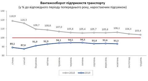 Вантажооборот підприємств транспорту у січні-жовтні становив 8,9 млрд.ткм і, порівняно з цими місяцями 2018 року, зменшився на 6,7%.
