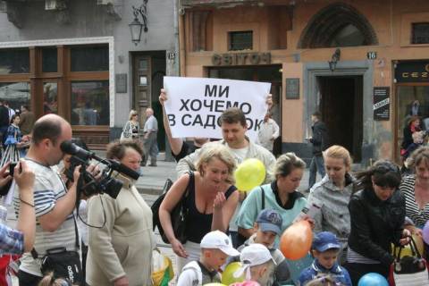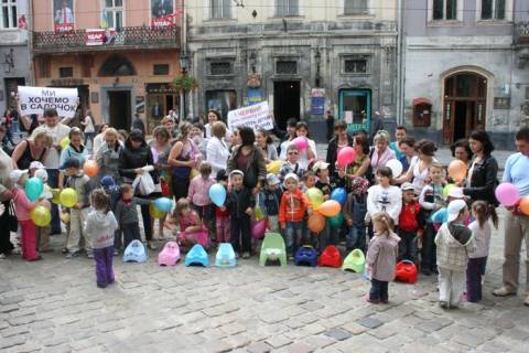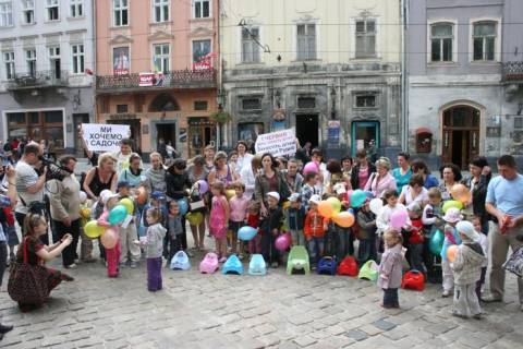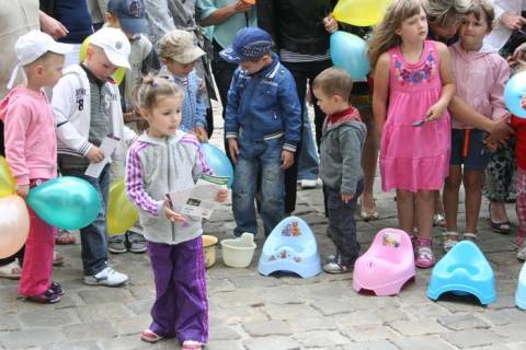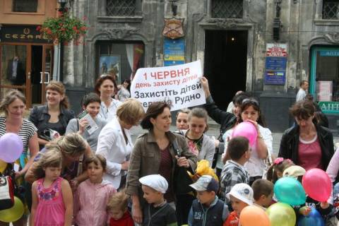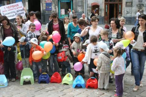 Сьогодні,1 червня, перед входом в Ратушу батьки та діти селища Рудно проводять "Флеш-моб із горщиками", щоб привернути увагу влади міста до проблеми каналізування селища.