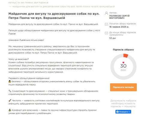 На порталі е-петицій Львівської міської ради 16 червня Сергій Поляков зареєстрував петицію з проханням облаштувати майданчик для вигулу та дресування собак по вул. Петра Панча чи вул. Варшавській, що у Шевченківському районі Львова.