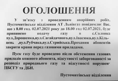 Сьогодні, 2 липня, з 08:00 год до 18:00 год Пустомитівсьтке відділення АТ "Львівгаз" припинило подачу газу у селі Солонка до таких вулиць: Дорошенка, Сагайдачного, Івасюка, Кільцева, Рубчака, Стрийська.