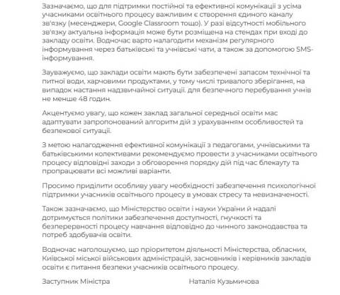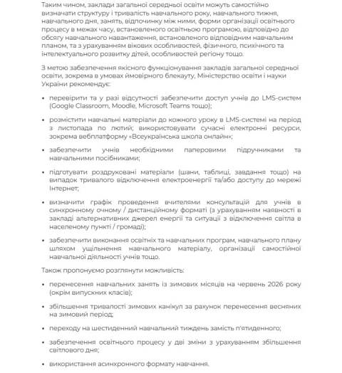 Окрім того, школи мають перевірити та у разі відсутності забезпечити доступ учнів до систем дистанційного навчання та розмістити навчальні матеріали до кожного уроку в системі на період з листопада до лютого.