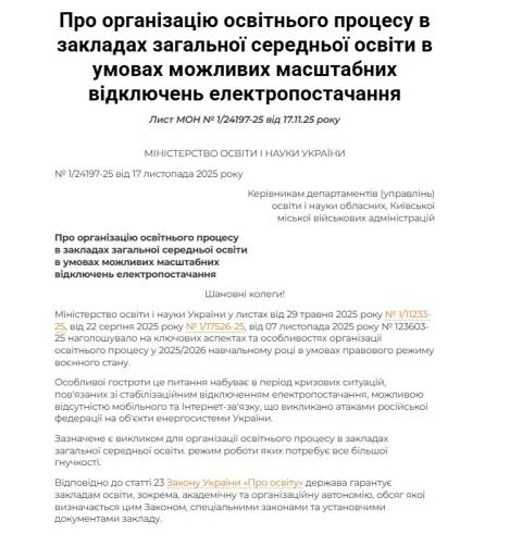 Міністерство освіти і науки направило лист закладам середньої освіти, у якому пропонує їм змінити структуру й тривалість навчального року через можливі довготривалі блекаути.